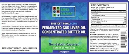 Buy green pasture blue ice fermented cod liver oil blue ice fermented skate liver oil concentrated butter oils which are available in capsules or liquid gel.